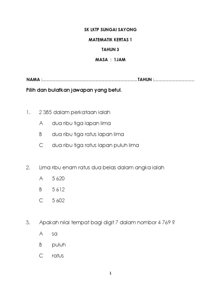 Soalan Matematik Tahun 3 Ujian 1 Bulan Mac 2018 Kertas 1 Pdf